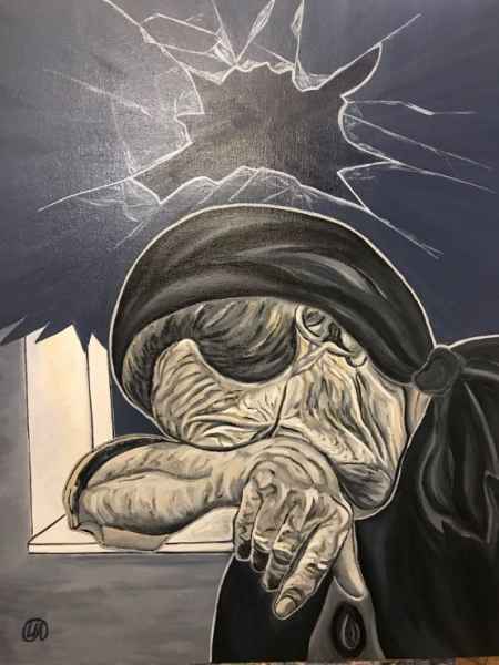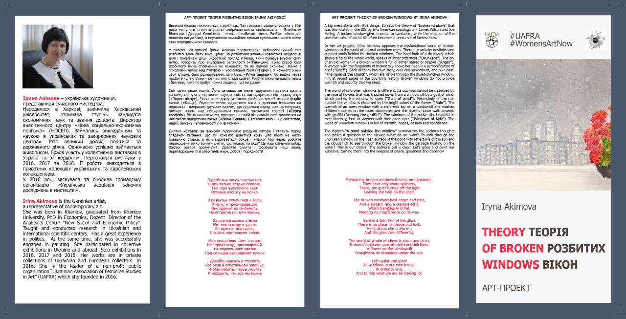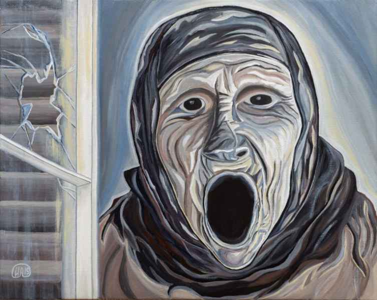 In her art project, Irina Akimova opposes the dysfunctional world of broken windows to the world of normal unbroken ones. There are unlucky destinies and crippled souls behind the broken windows. The hard look of a drunkard, which shows a fig to the whole world, speaks of inner bitterness ("Drunkard"). The cry of an old woman in a broken window is full of either hatred or despair (“Cry”). A woman with the fragments of broken sky above her head is the personification of grief ("Grief"). Each of them has own story, own disappointment, and own pain. The ruins of the church, which are visible through the bullet-punched window, constitute a part of the country's history. Broken windows do not provide the warmth and security that every person and all of us need.