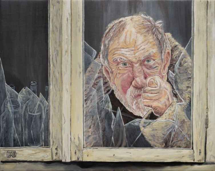 In her art project, Irina Akimova opposes the dysfunctional world of broken windows to the world of normal unbroken ones. There are unlucky destinies and crippled souls behind the broken windows. The hard look of a drunkard, which shows a fig to the whole world, speaks of inner bitterness ("Drunkard"). The cry of an old woman in a broken window is full of either hatred or despair (“Cry”). A woman with the fragments of broken sky above her head is the personification of grief ("Grief"). Each of them has own story, own disappointment, and own pain. The ruins of the church, which are visible through the bullet-punched window, constitute a part of the country's history. Broken windows do not provide the warmth and security that every person and all of us need.