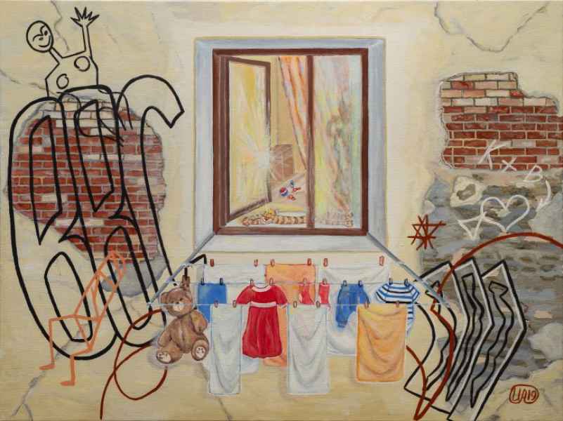 The diptych “A pond outside the window” summarizes the author’s thoughts and poses a question to the viewer. What do we want? To look through the unbroken window on the clean surface of the pond with t sun and clouds reflections? Or to see the garbage floating on the water through the broken window? This is our choice. The author's call is clear: Let's glass and paint our windows, turning them into the keepers of peace, goodness and decency.